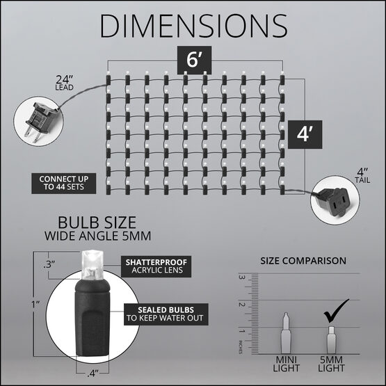 5MM-4x6-150L-MU-G-UL | UL 120V 22# Green Wire 150L 5MM Wide Angle 4X6 ' Net light, Lead in 12", Lead out 4", UL plug with rectifier ,Multi (R/Y/B/G/O) |