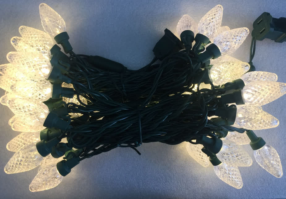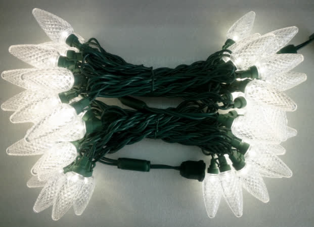 IM-C7-50-8-PW-G-CSA CSA 120V 22# Green Wire  50L C7 Faceted   4X8X4"  light set ,Lead in 4",Bulbs Spacing 8", Lead out 4" ,  CSA plug with rectifier ,Pure white, I-mold constuction