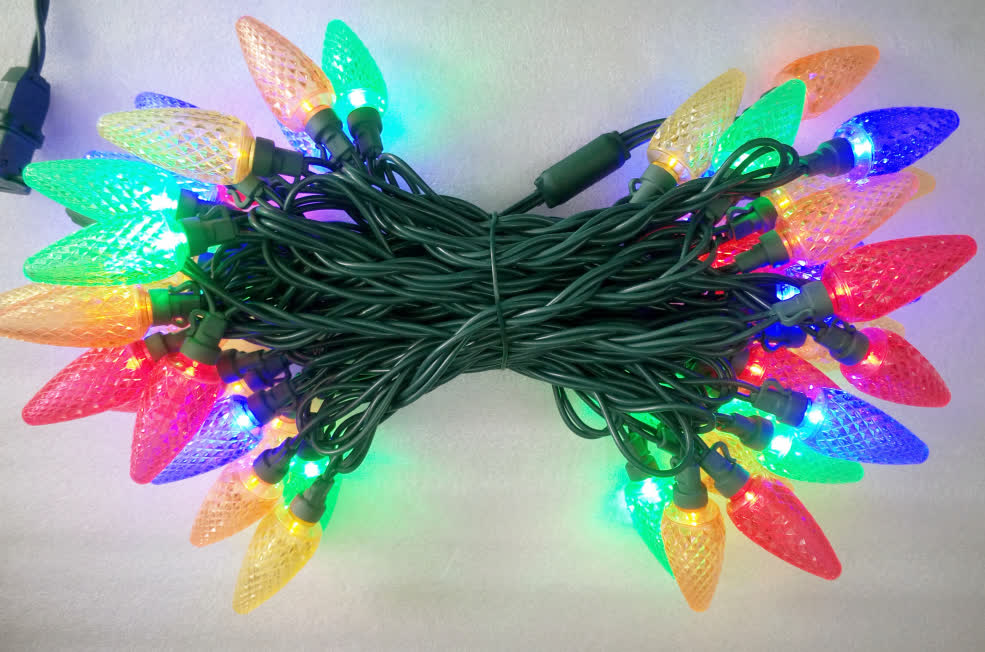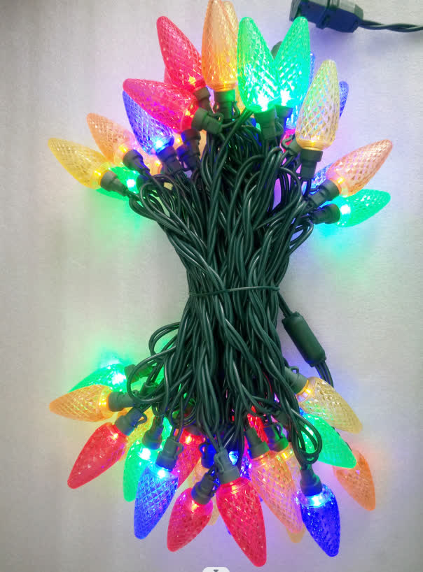 IM-C9-50-8-MU-G-UL | UL 120V 22# Green Wire 50L C9 Faceted 4X8X4" light set ,Lead in 4", Bulbs Spacing 8", Lead out 4" , UL plug with rectifier ,Multi (R/Y/B/G/O), I-mold constuction |